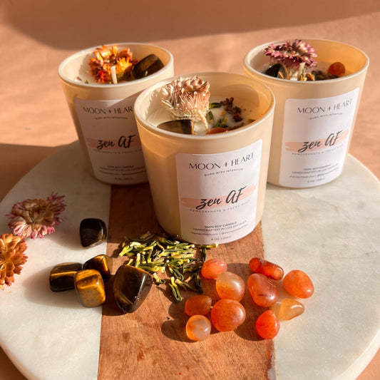 ZEN AF Intention Soy Wax Candle | Carnelian , Tiger’s Eye | Scent: Sweet Pomegranate & Cucumber MintRegular price From $23.50 USDRegular priceUnit price / per$26.00 USDSale price From $23.50 USDSale