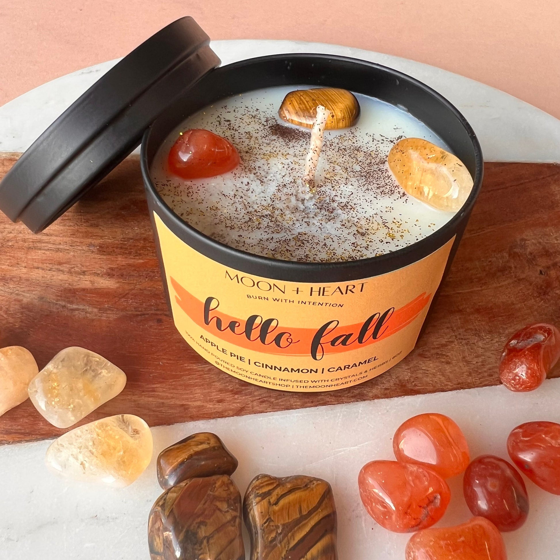 Hello Fall Intention Candle with crystals | Manifestation Candle | Cool Candles | Crystal Infused Candle