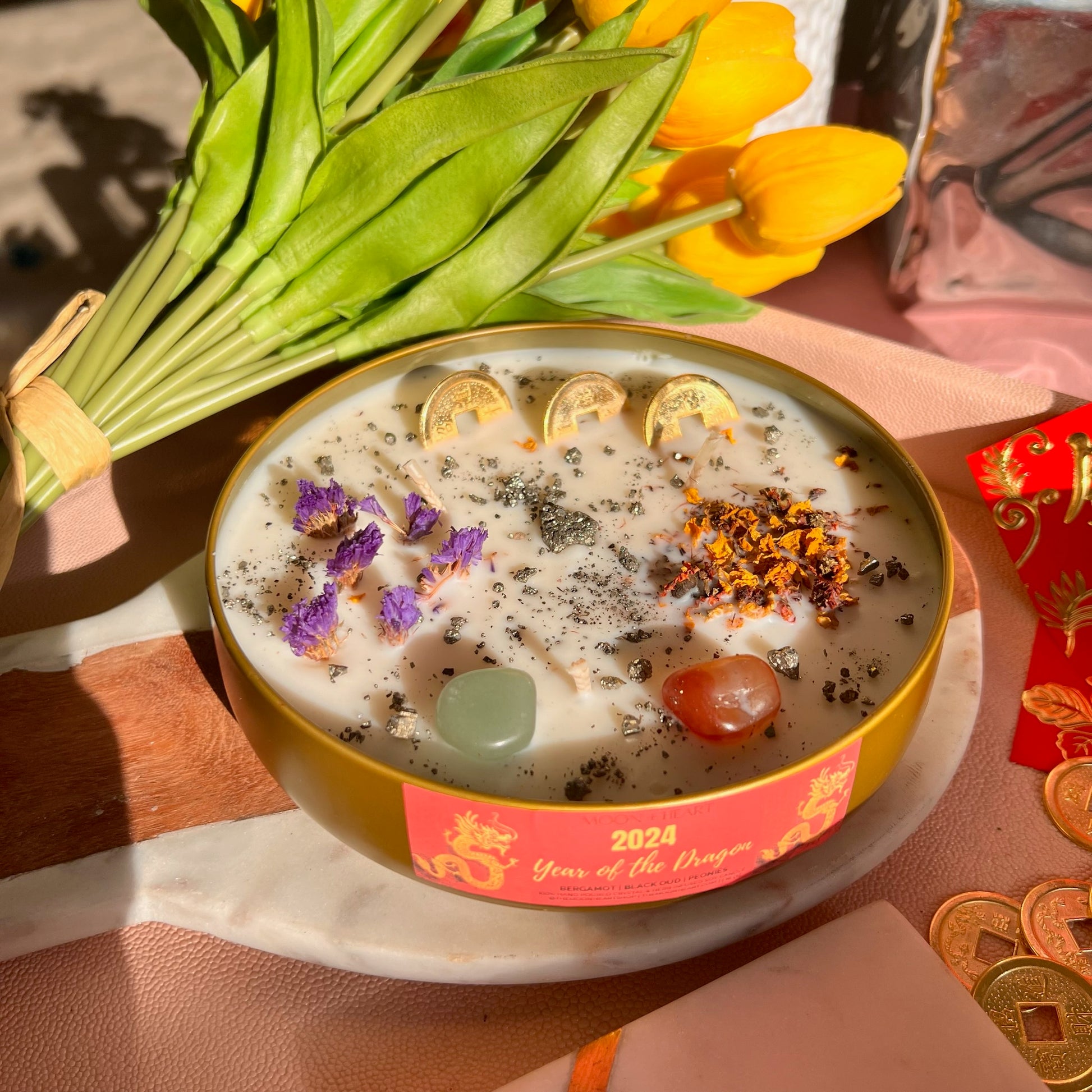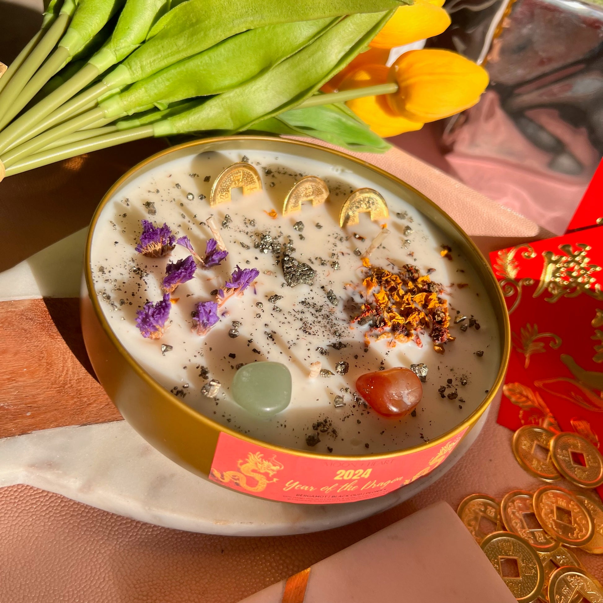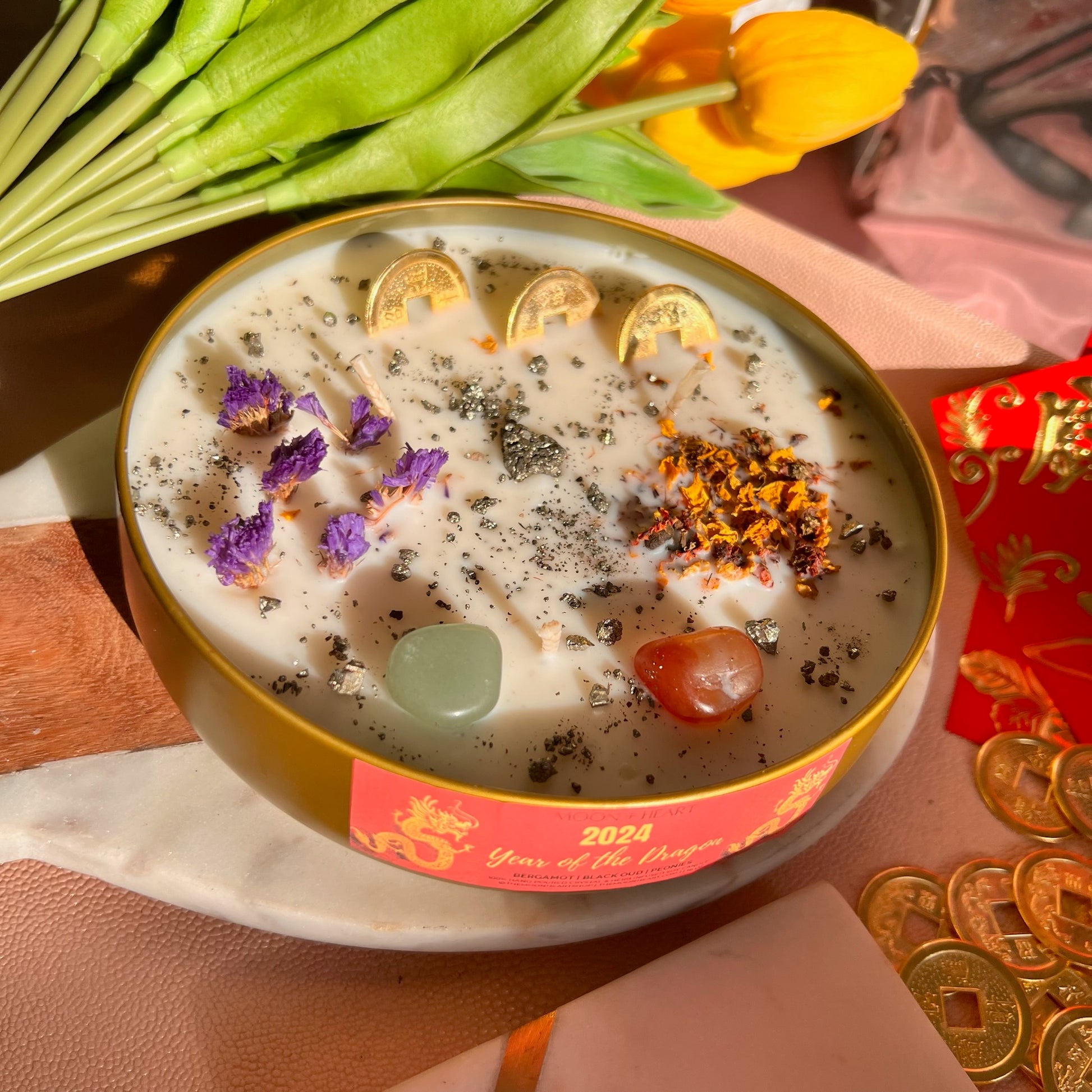 Year of the DRAGON 2024 Intention Candle | Manifestation Candle with green aventurine, carnelian and 3 feng shui coins.
