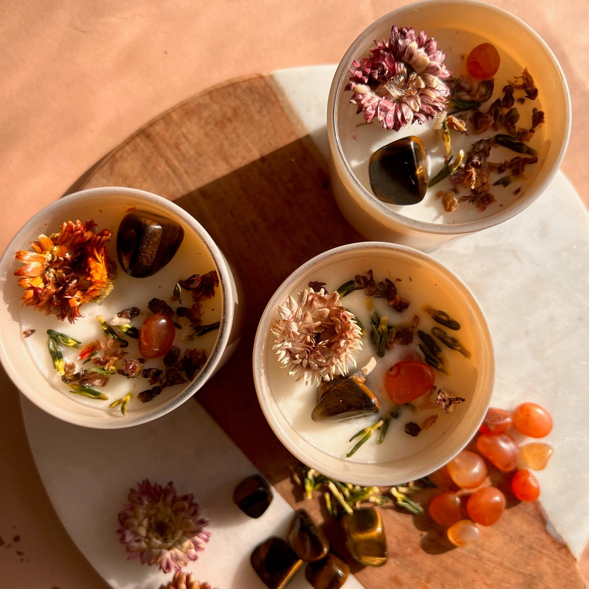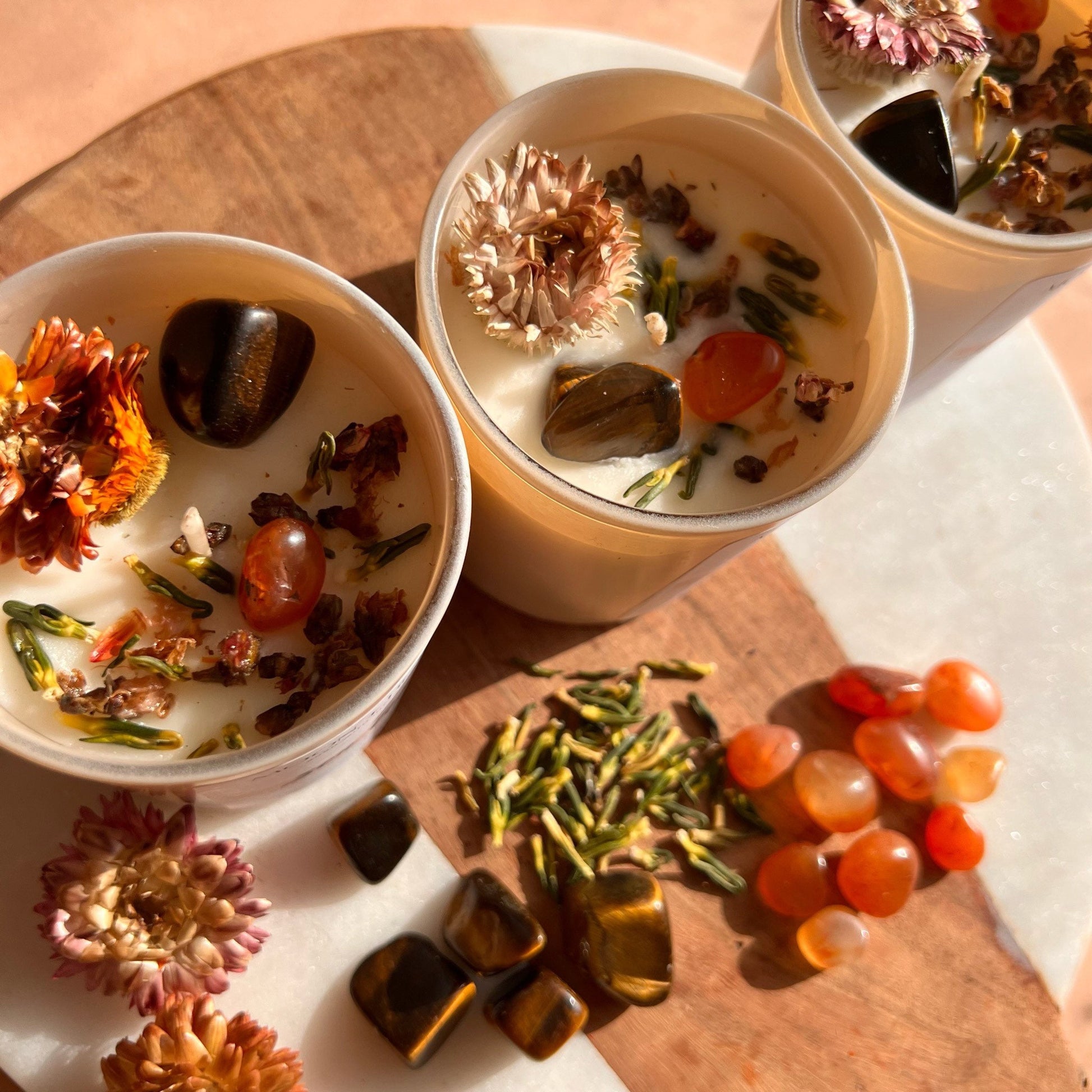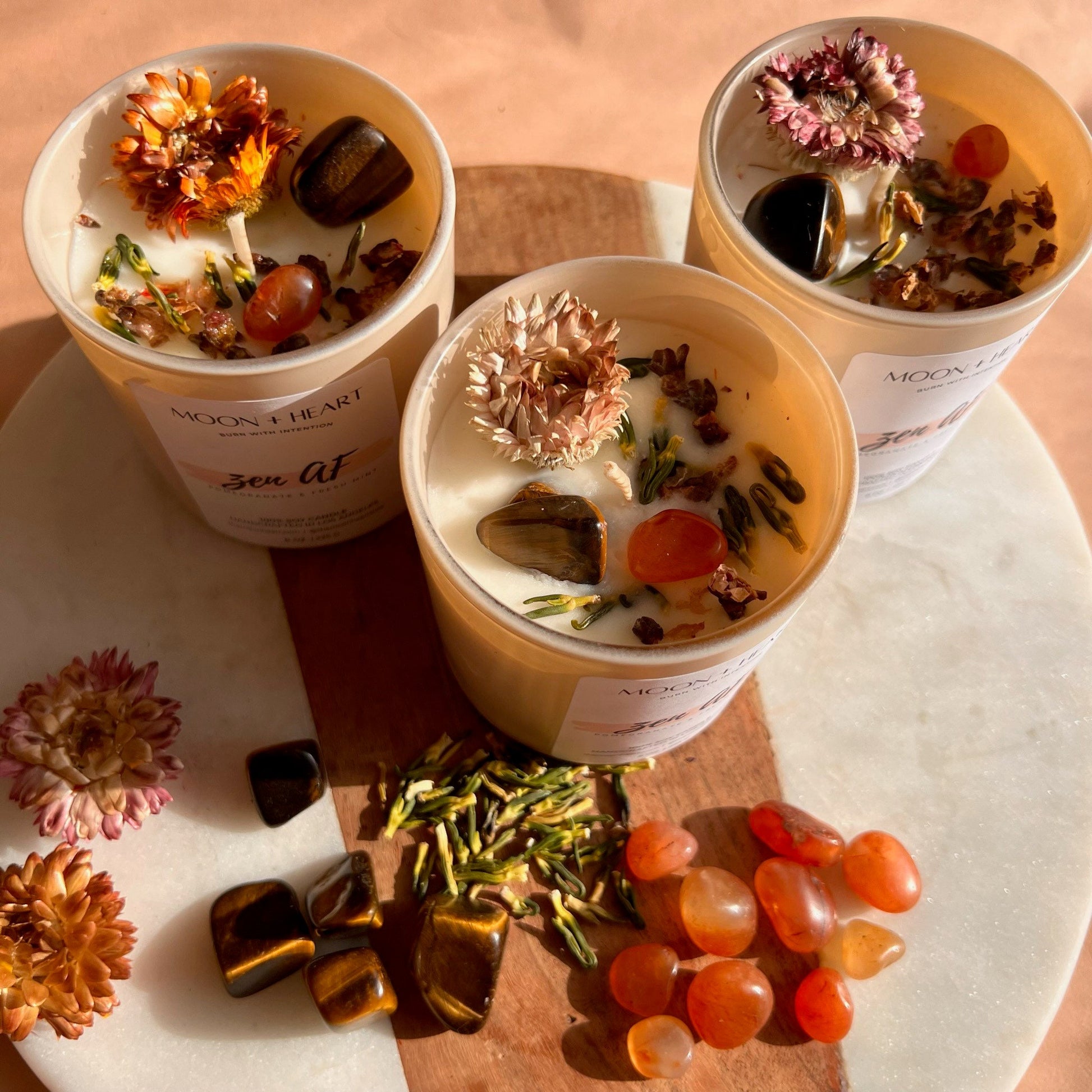 Our ZEN AF Intention Organic Soy Wax Candle | Carnelian , Tiger’s Eye and dried flowers is a candle to bring you serenity, peace and zen vibes.